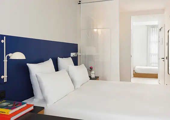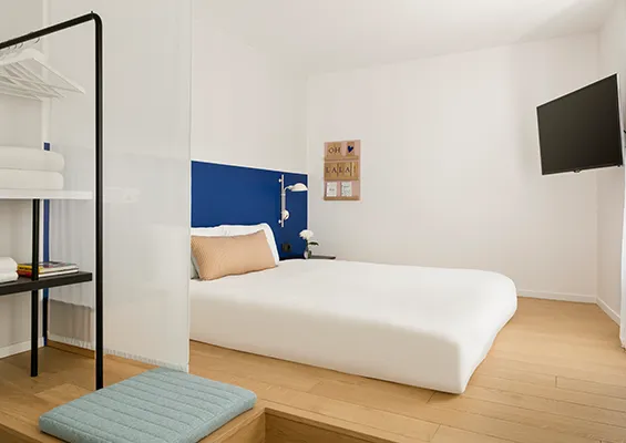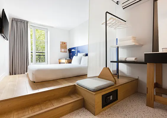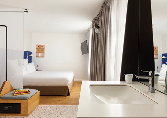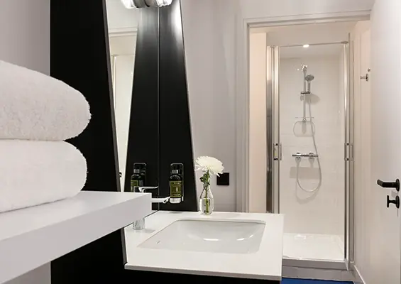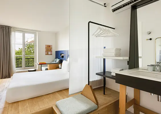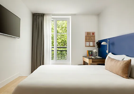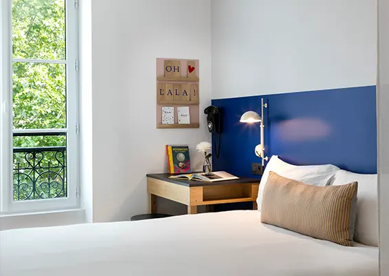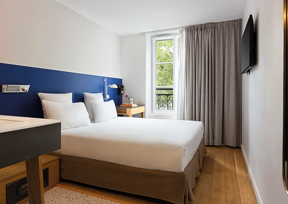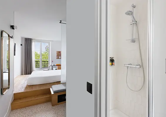 Whether you’re travelling on your own or with someone, our double rooms with courtyard views are cosy havens opening onto Passage du Cheval Blanc, in the heart of the 11th arrondissement of Paris. Fitted with a large, comfortable bed and a refined bathroom with shower, these rooms guarantee a relaxing stay in Paris.